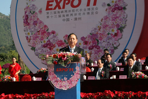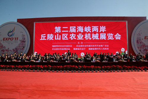 2011年12月2-4日,由海峡两岸农业交流协会、农业部农业机械化技术开发推广总站(农业部农机监理总站)、福建省农业厅、福建省漳州市人民政府共同主办的“第二届海峡两岸丘陵山区农业机械展览会”在福建漳州隆重召开。 12月3日,漳州花博园花团锦簇,彩旗招展。农业部原副部长张延禧,海峡两岸农业交流协会副会长李永华,农业部农机化司副司长刘恒新,农业部科教司副司长潘海平,农业部农机推广总站站长刘宪、副站长涂志强、副站长李安宁,农业部农机鉴定总站刘敏站长,中国农机化协会常务副会长马世青,农业部规划设计研究院崔军副院长、农业部南京农机化所副所长梁建,中国工程院院士、华南农业大学罗锡文教授,中国农业大学张东兴、杨敏丽教授,福建省农业厅陈绍军厅长、郭跃进副厅长,福建省农机局局长高咸周,漳州市人民政府市长等领导出席开幕式。