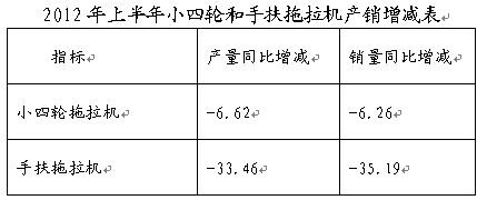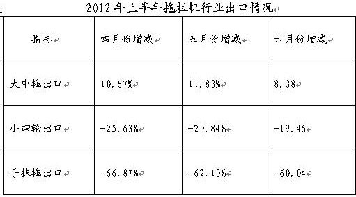 小四轮拖拉机产销总量同比分别下降6.62%和6.26%,手扶拖拉机产销总量同比分别下降33.46%和35.19%,降幅继续加深。 三、行业出口情况: 2012年上半年,大中型拖拉机行业累计出口总量同比增长8.38%,小四轮拖拉机行业累计出口同比下降19.46%,手扶拖拉机行业累计出口同比下降60.04%。