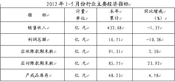 大中型拖拉机出口虽有所增长,但增幅回落,小四轮和手扶拖拉机出口依然下滑,降幅略有回升。 四、2012年1-5月份骨干企业经济运行状况 据骨干企业数据显示: 2012年1-5月份,行业21家骨干企业中,销售收入同比正增长6家,负增长15家;利润总额同比正增长8家,负增长13家,其中亏损企业7家,占行业的三分之一,微利企业2家(利润总额在10万元以下)。 1-5月份,行业综合销售利润率为3.86%,其中低于行业平均水平的15家,占行业家数的三分之二,表明行业整体盈利水平低下。