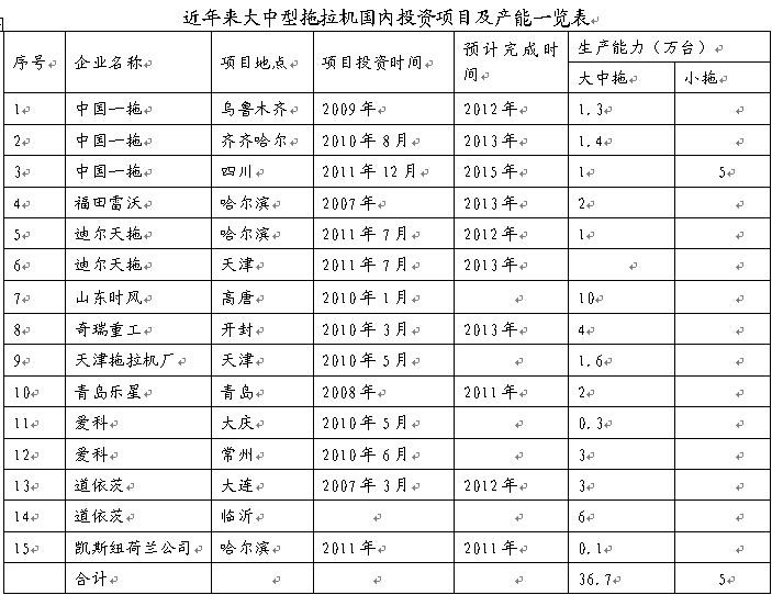 可以看出:新项目完全达产后已经具备了近37万台的生产能力,接近2011年的历史新高38.8万台销量。 据悉,上述项目虽然大部分还没有达到投产期,但是基本上都具备了一定的生产能力,2012年和2013年将集中进入完工期,市场一旦启动,马上可以形成产能; 现有的产能和新达产项目的产能保守的估计应该在90万台以上,达到或超过市场需求的2-3倍,且同质化严重,因此行业产能过剩毋庸置疑,新一轮的竞争格局将加速行业洗牌。 行业点评: 从上半年行业整体的运行状况、国内外宏观形势变化以及产能过剩等等综合方面来看:2012年起,拖拉机行业将进入3-5年的调整期,行业洗牌在所难免。 各家企业从现在起要做好充分的思想准备,以积极的心态去面对和承接各种困难和挑战,理清思路和方向,做好主销市场、细分市场、专业市场的调研,了解农机用户实实在在的需求,寻找新的商机,拓展渠道,加速产品研发和品牌打造,策略上可以采取积极寻求多方合作、引入战略投资者、进入资本市场、发行公司债券、并购上下游产业链、产销联手等多种形式,在调整期中找到自身的突破口,扬长避短,不断调整运行姿态,才能在今后激烈的市场竞争中立足根基。 |