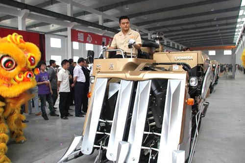 万台收割机项目投产庆典仪式 莱恩公司年产10000台高性能收割机项目的建成投产,为莱恩增强核心竞争力和可持续、超常规、跨越式的发展提供了良好机遇,同时也为莱恩公司进一步做大做强奠定了坚实的基础。莱恩农业装备公司自成立以来,用了不到二年的时间,完成了计划建设周期为二年半、项目总投资3.38亿、建筑总面积为 8.4万m2,年产能力达万台高性能收割机的项目建设。公司成立不到两年的时间,先后成功研发了具有自主知识(已取得国家专利权12项,并且还有29项专利申报成功)的产品LN65A半喂入联合收割机、LN2.5A全喂入联合收割机、高速插秧机等产品。目前莱恩半喂入收割机产品已获得国家推广鉴定证书,入选2011年国家补贴目录。全喂入联合收割机和高速插秧机等产品也经过多次试验,正在做产品相关鉴定,预计2012年可入选国家农机购置补贴目录。与此同时,莱恩还投入3000万元打造莱恩农业装备专属"心脏"--莱恩农装发动机。 在众人瞩目下,上午10点18分,莱恩年产万台高性能收割机项目竣工投产首台LN65A半喂入联合收割机"浓妆"下线。金色与银色构成的机身,与当今市场主流收获机产品的颜色形成了明显的差异,给人贵重的质感。除了外在的品质,莱恩高性能收割机还拥有了几十项自主知识产权的产品性能创新,并在业界首次提出了产品远程伺服和保姆服务,通过在产品关键部件中安装的传感器,采集机器部件的运行状况,并将运行状态通过GPRS和GPS发送到产品运行监控中心,使得每台机器的运行状态能够得到及时跟踪,并在机器可能出现运行故障前发送故障预警,产品运行监控中心能够根据故障预警为用户提供远程伺服,并为故障提供指导性解决方案。这些新技术手段的应用,仅创新的观念即将引领行业的潮流。