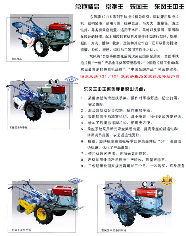 公司秉承“服务农业、造福于民”的经营理念,全面提升企业综合素质。东风牌手扶拖拉机二次荣获国家金质奖;1986年企业荣获国家质量管理奖,1995年在全国同行中率先通过ISO9000质量体系认证;1999年“东风”、“DF”商标被认定为中国驰名商标。进入21世纪,东风农机产品相继被国家有关部门授予“中国名牌产品”;“最具市场竞争力品牌”;“自主创新能力行业十强”;“中国机电商会推荐出口品牌”;“全国农机行业优质服务先进单位”。以及通过了“CAM认证”;“3C认证”;“EPA认证”;“EC认证”;“ISO14001:2004认证”等。